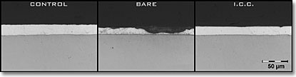 An unexpected benefit of this product is offered by its rubber adhesive membrane. The adhesive layer acts as a barrier that adds additional protection, isolating the washcoat of the panel from corrosive vapors often found in structures used for animal confinement. In light of this, an experiment was performed on bare galvanized and Galvalume ® steel to determine the actual amount of protection offered by the extra layer. The experiment consisted of a 1000 hour test that exposed the interior of panels (with and without I.C.C.) to condensation from heated liquid manure. The results, shown in the pictures below, show a clear indication that metal panels are in fact shielded from the corrosive compounds. These findings strongly suggest that panels with I.C.C. will offer a greatly extended service life in conditions that typically void the paint system warranties.